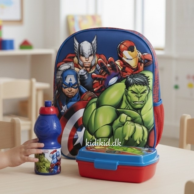 Supersejt sæt rygsæk og madkasse, drikkedunk med Avengers superhelte motiv