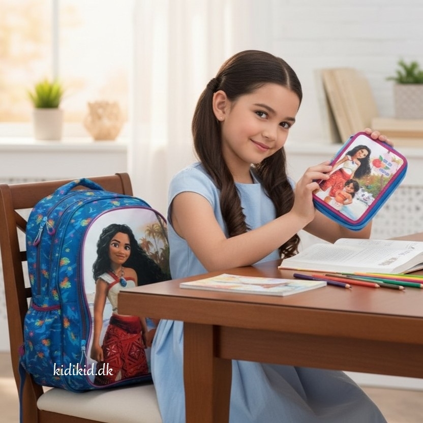 • 2 separate rum, som åbnes og lukkes med lynlåse, fyldt med praktisk skoletilbehør.