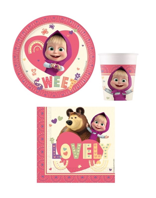 Masha og Bjørnen Sweat Heart paptallerkner, servietter , krus til 8 personer