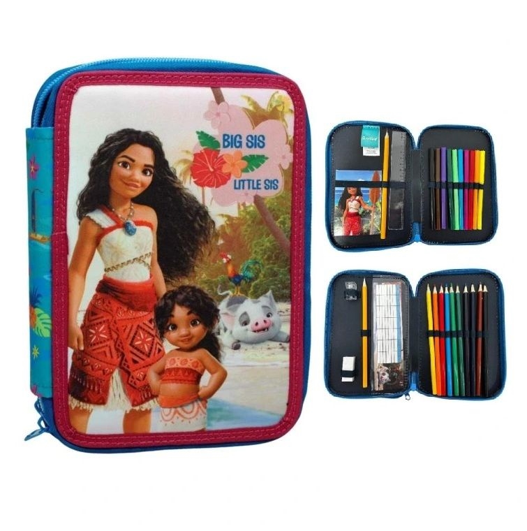 Gør skolestarten sjovere med dette officielle Disney Vaiana penalhus fyldt med indhold! Penalhuset indeholder blyanter, kuglepenne, viskelæder, blyantspidser og farveblyanter – alt dit barn har brug for til skoledagen. Det flotte motiv viser Vaiana, hendes lille søster Siema og deres søde gris, omgivet af smukke polynesiske ø-elementer.